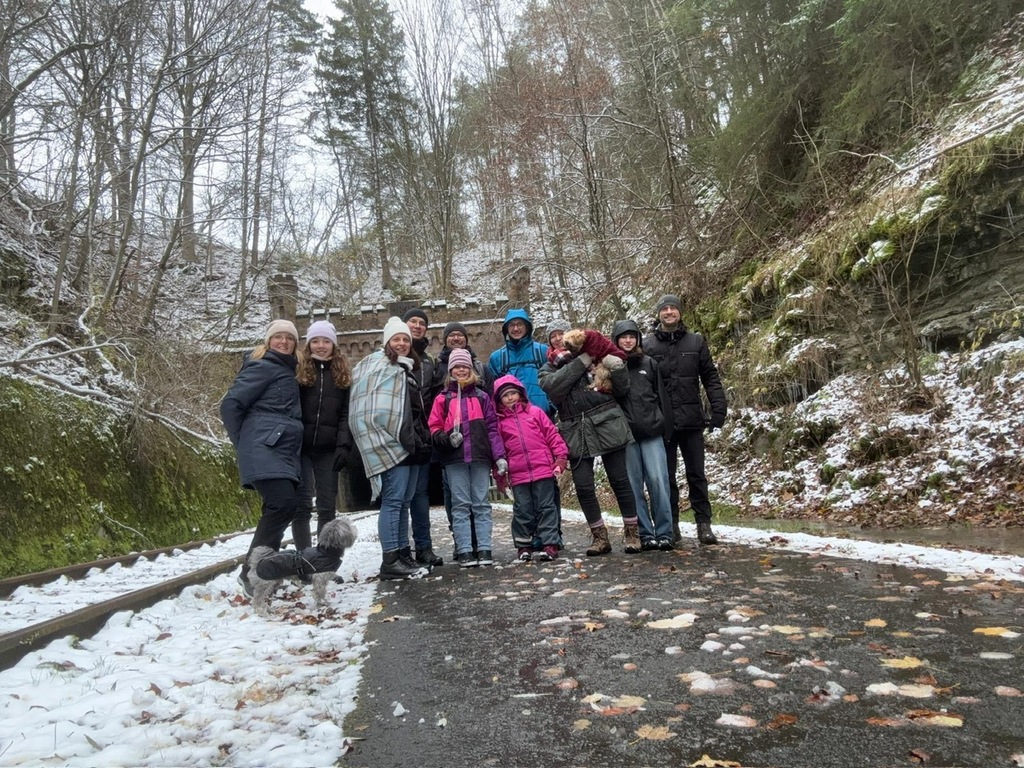 Entlang des Kanonenbahnradwegs vorbei an einer Vielzahl großer Eiszapfen, welche die Kinder begeistert einsammelten, erreichten wir den Küllstedter Tunnel,