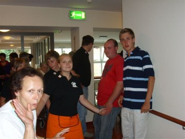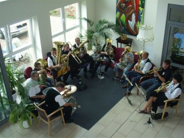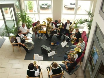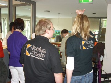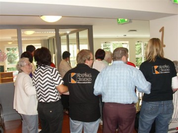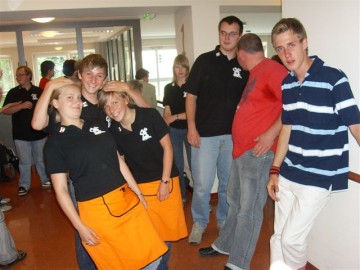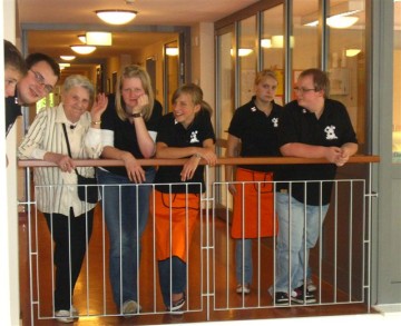 Wie bei unserem ersten Besuch versprochen, kamen am Mittwoch, den 9.Juli ca. 15 Jugendliche der Kolping Jugend auf dem Hof des Johanniteraltenheims an, um den Bewohnern des Heims ihr Sommerfest noch etwas zu verschönern, indem wir für die Bedienung und ein kleines Programm sorgten. Leider machte uns das Wetter einen Strich durch die Rechnung, sodass das Fest nach innen auf zwei Etagen verlegt werden musste, was der guten Stimmung jedoch nicht anhaben konnte. Pünktlich zur Kafffeezeit wurden Kuchen, Waffeln, Kaffee und Tee serviert, bis auch der letzte satt war. Anschließend sorgten einige Showeinlagen für Abwechslung. Beispielsweise spielten zwei unserer Jugendlichen einige Stücke auf ihren Jagdhörnern, und das Ganze sogar zweimal, da ja jede Etage etwas davon hören wollte. Daraufhin bekamen wir Besuch von Hans Gerd Adler, der einige Schnorren aus seinem Buch zum Besten gab und die Bewohner des Heims damit sehr zum Lachen brachte. Höhepunkt war schließlich der Einzug der Rothenberg Musikanten, die aufgrund ihrer großen Anzahl nur im Flur Platz nehmen konnten, von da aber durch das ganze Haus über alle Etagen zu hören waren. Das gemeinsame Abendessen schloss den Tag, nach vielen wertvollen gemeinsamen Stunden ab und wir verabschiedeten uns mit einem "Auf Wiedersehen".